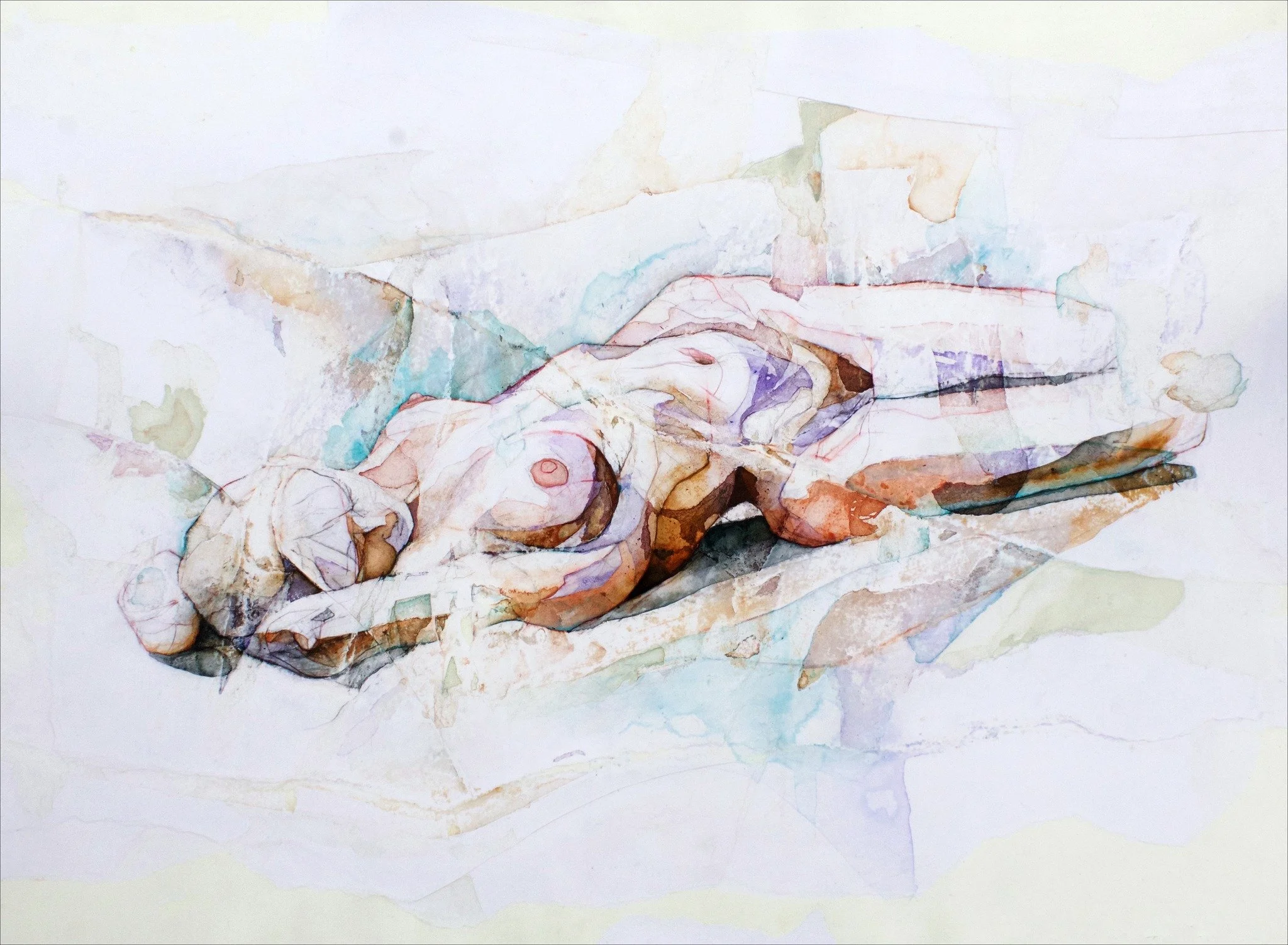 This body of work begins with contour-line figure drawings made from life and remains intentionally unresolved. According to the artist, “Using layered mixed media—torn paper, graphite, ink, gouache, and water-soluble colored pencil—I work into and against the drawings, placing the figures in a suspended state that appears grounded within a liminal space.