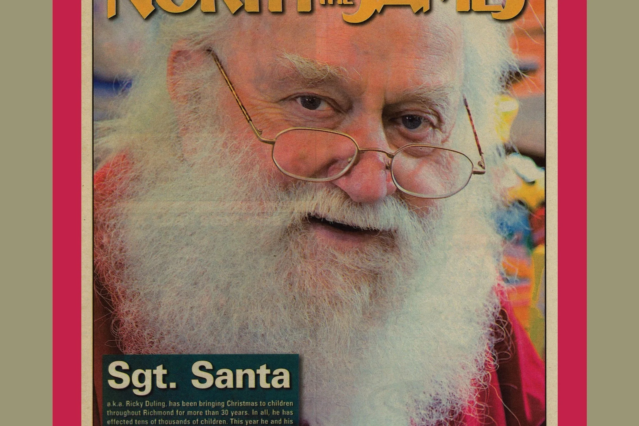 I’m seated at a long table cluttered with boxes of bulk candy canes that are being packaged in small sacks by some 30 elves, all working methodically while singing Christmas carols. The head elf, Ruby Clanton, answers the phone, which rings about every other minute. And next to me in a folding chair is the man himself—Sgt. Santa, dressed down in khakis, a blue work shirt, red suspenders and a teal nylon bomber jacket.