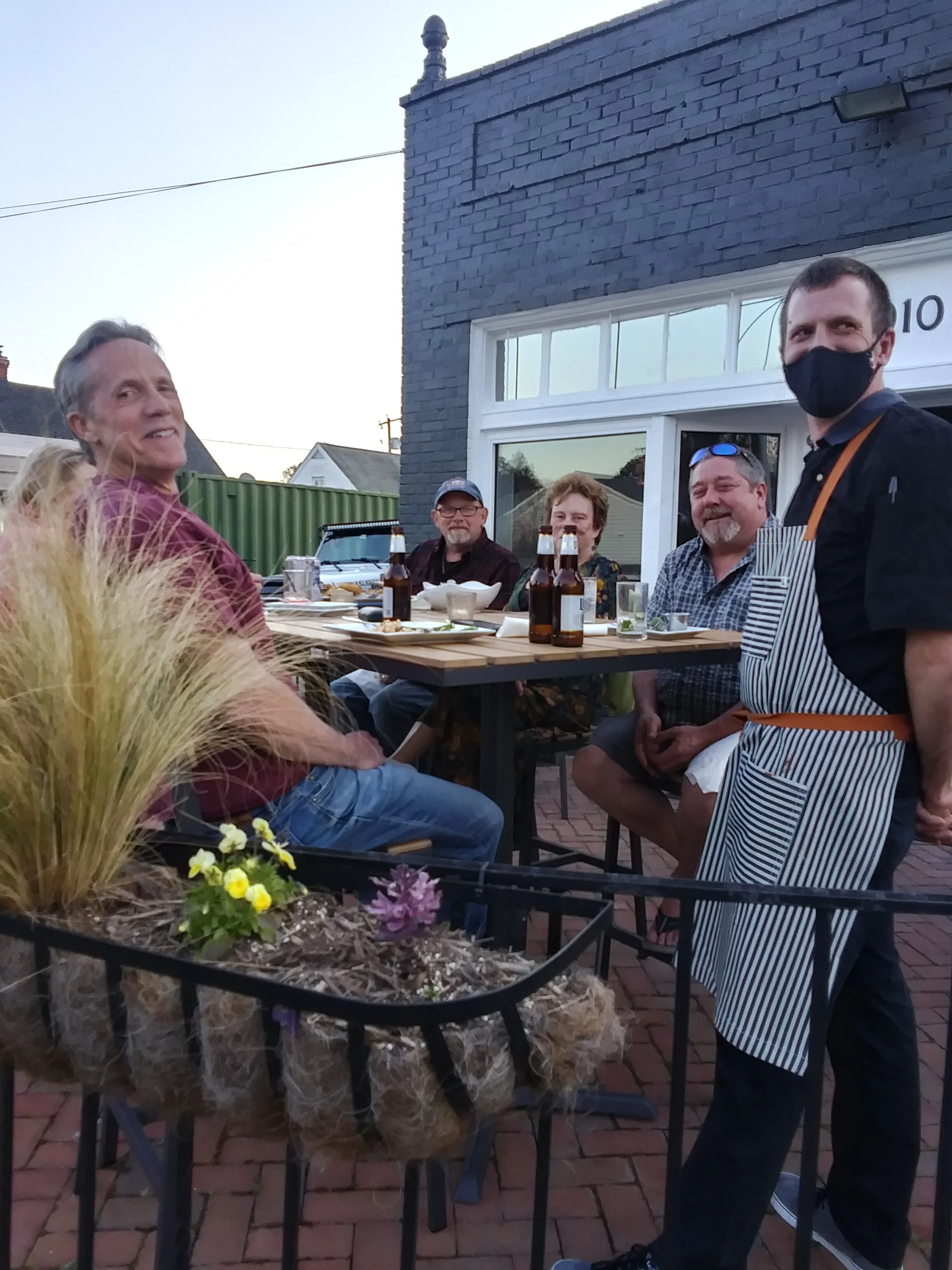 Former Hermitage Grill owners John Meyers and Waller McCracken at a table on the front patio the evening of the in-person reopening. A masked and aproned Tracey Thoroman, who, with his wife Kristin, owns HOBNOB checks on his guests.